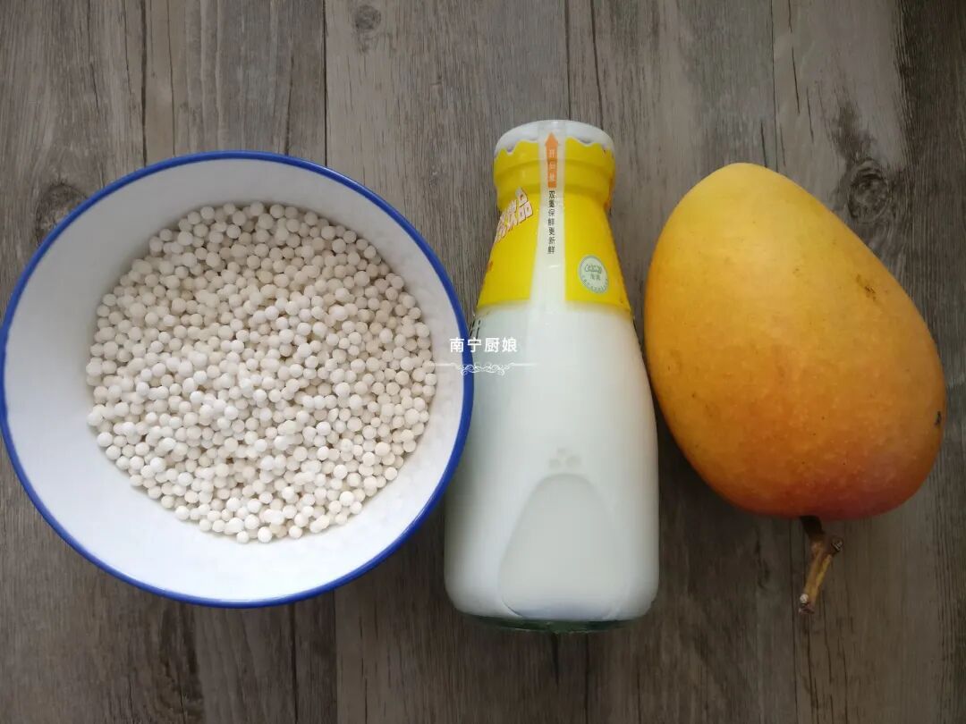 准备好食材:大台农芒果1个、牛奶一瓶、西米半碗(150克左右)、白砂糖