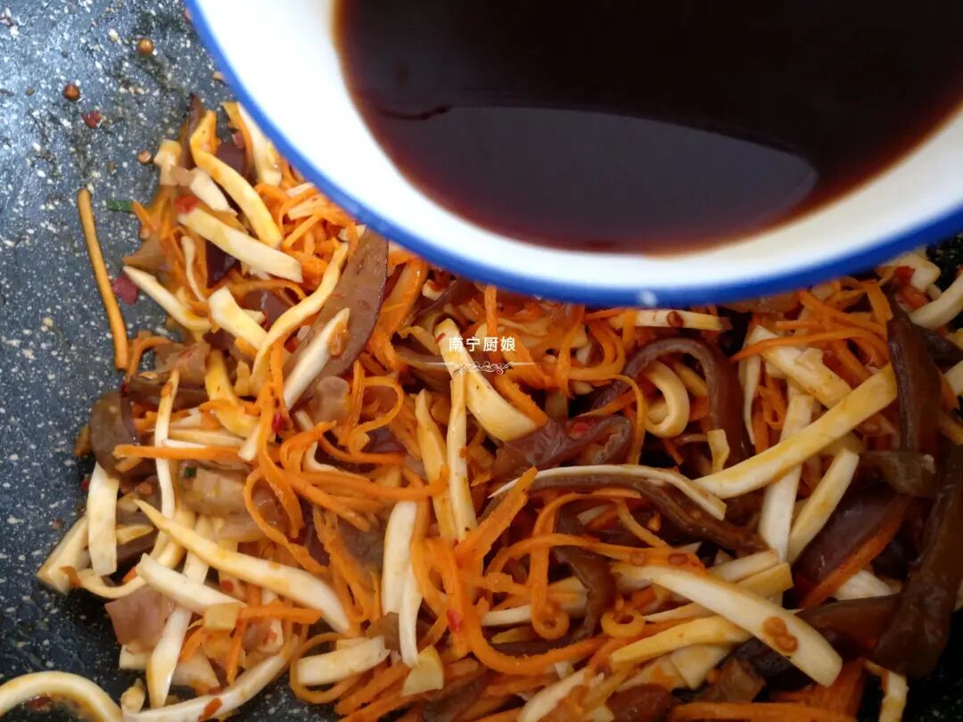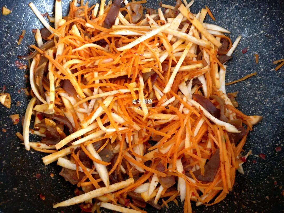 5、把杏鲍菇丝和胡萝卜丝一起倒进去翻炒均匀