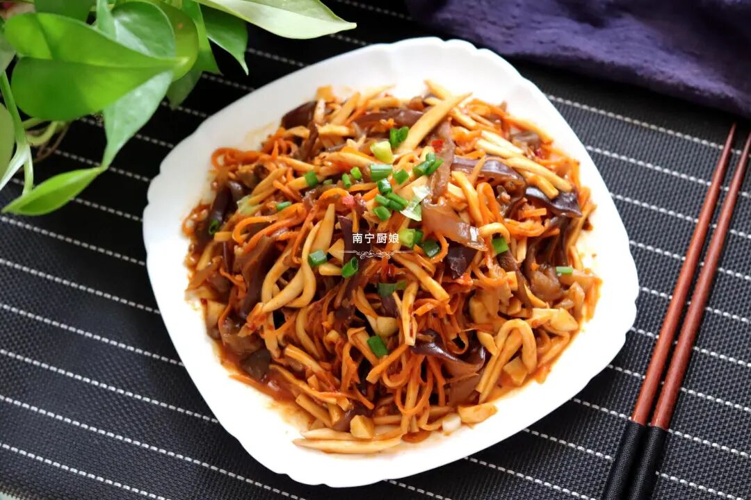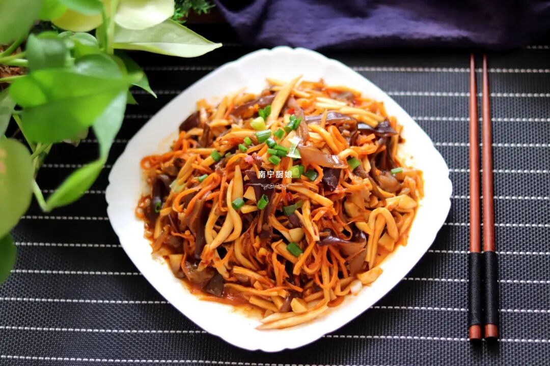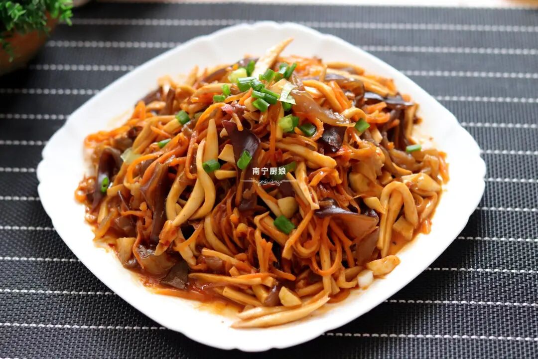 其实有一道菜和鱼香肉丝相同,没有肉丝,但味道却比鱼香肉丝还要好吃下饭!这道菜就是鱼香杏鲍菇,鱼香杏鲍菇这道下饭菜的食材主要是杏鲍菇、胡萝卜、木耳丝,调料方面几乎适合鱼香肉丝一样的,只是少了肉丝和竹笋而已。这菜比鱼香肉丝还要好吃10倍,每次家里做,家人总抱怨饭不够吃!