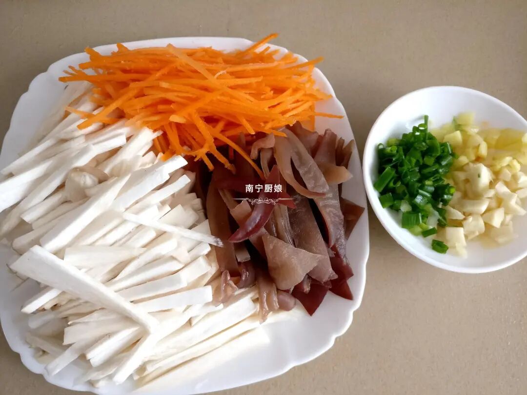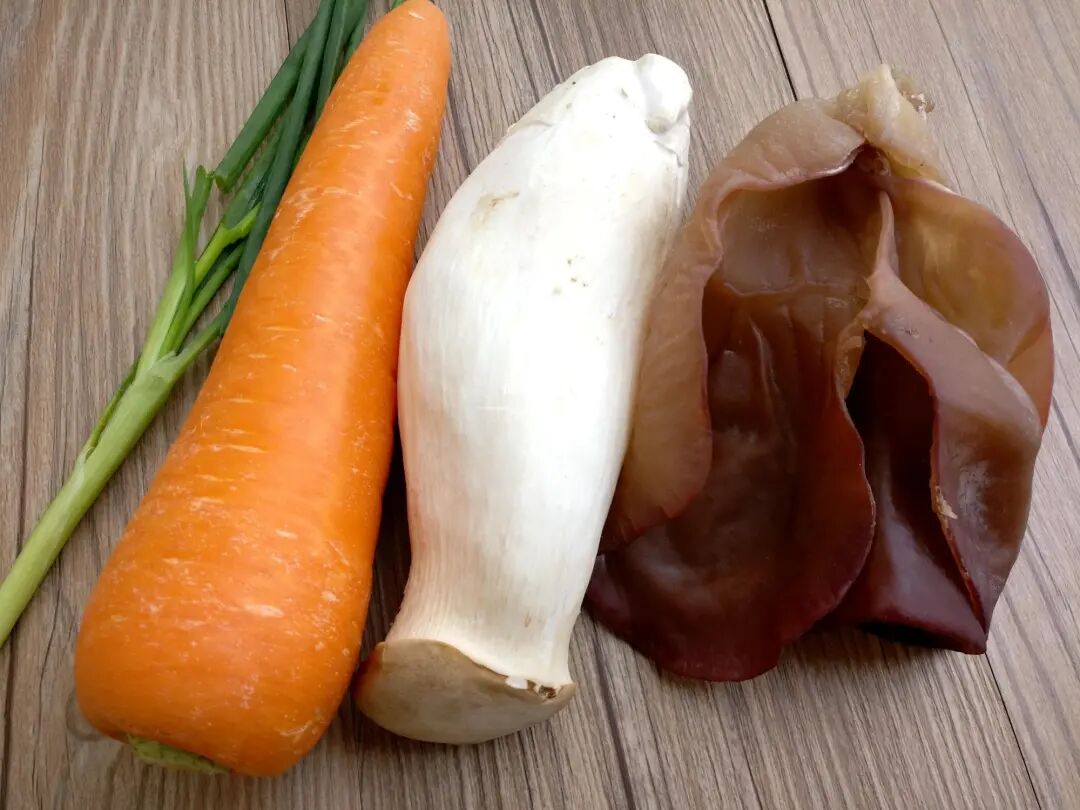 1、把杏鲍菇洗净后切细条、胡萝卜刮皮后切丝、木耳洗净后切丝、葱花、蒜米、生姜洗净后切碎