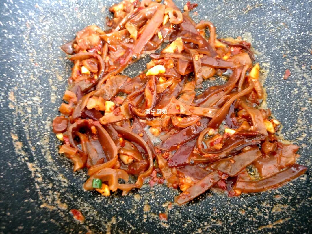 6、倒入刚才调制好的酱汁一起翻炒均匀,炒至酱汁粘稠即可出锅
