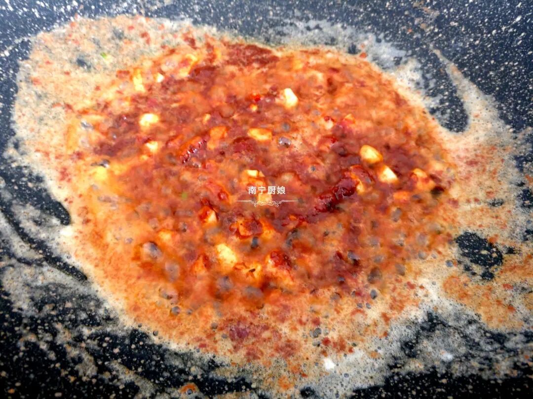 3、起锅,小火预热锅,然后倒入适量的花生油,把蒜米和生姜倒进去爆香,然后放入一勺豆瓣酱炒出红油