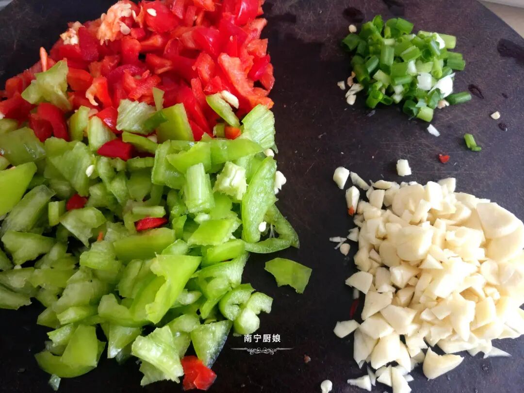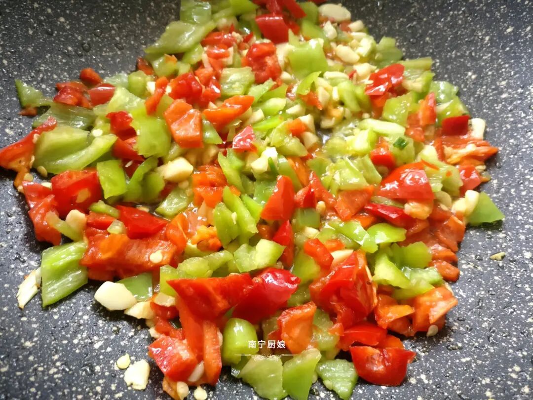 4、接着把青红椒碎倒进去一起翻炒十几秒