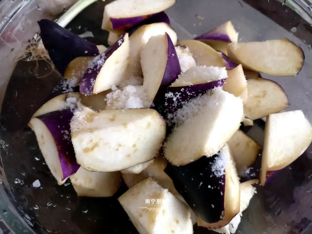 1、把茄子洗干净后切滚刀,放到碗里,放入一勺盐搅拌均匀腌制10分钟,让茄子脱水