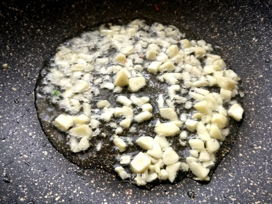 3、把锅架上,开小火预热锅,然后倒入日常做菜的油量烧热,把蒜米倒进去爆香