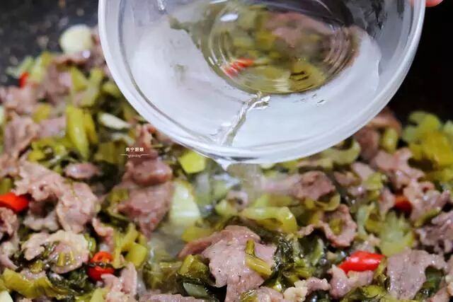 7、再倒入小半碗温水,用大火烧开,盖上锅盖焖3分钟,好让酸菜的酸味在汤水中释放出来后融入到牛肉中去,然后开盖收汁出锅。