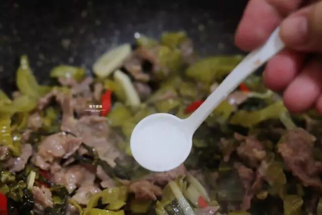 6、放入一小勺食盐调味,不用放太多,因为酸菜本身是用食盐腌制出来的,所以已经自带咸味。