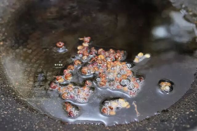 2、起锅小火热锅下凉油后,迅速倒入花椒粒爆香,不要热油的时候下花椒粒,这样很容易把花椒炒焦了,炒香后把花椒铲出扔掉。