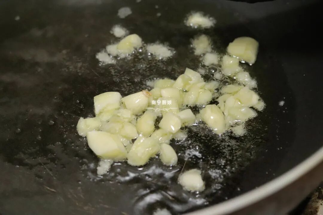 1、把锅架上,开小火热锅,倒入花生油烧热后把蒜米倒进去爆香