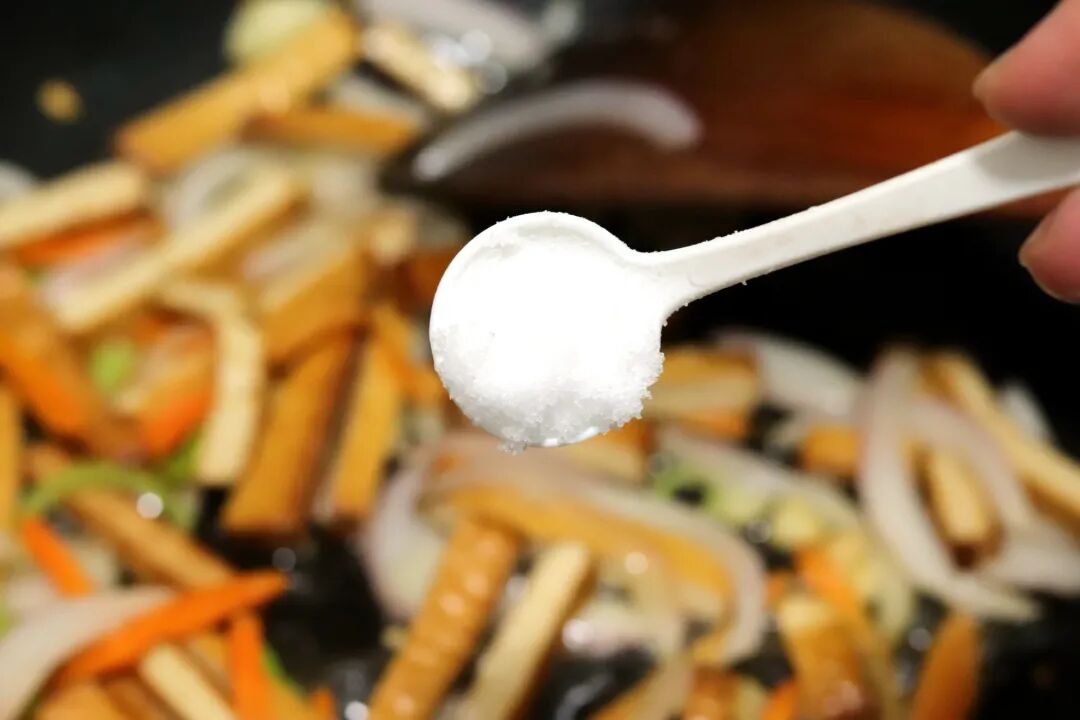 4、炒出洋葱香味后,放入一勺食盐,翻炒均匀