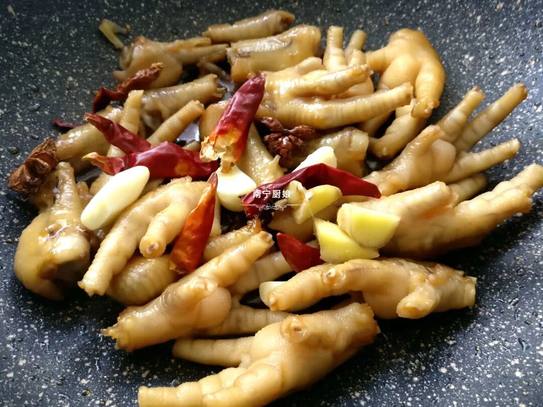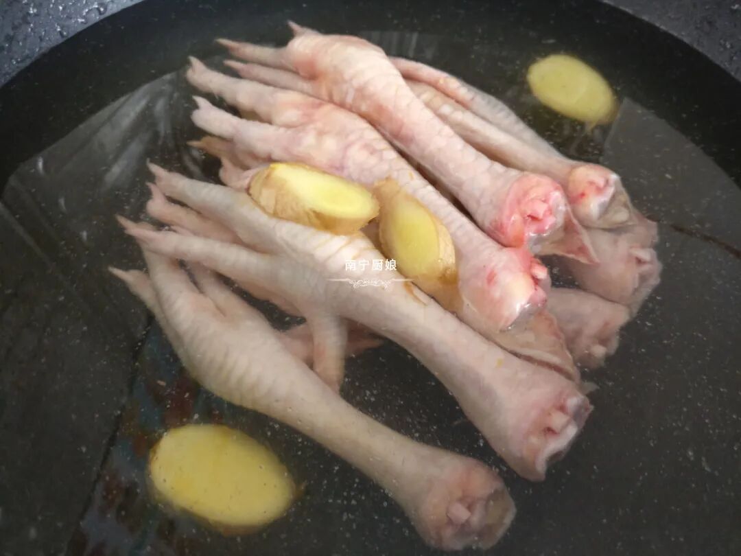 1、在锅里倒入半锅水,放入几片生姜,把鸡爪放进去解冻顺便焖煮15分钟(因为我的鸡爪昨天买的,回来放冰箱冷冻了,建议大家当天买新鲜的鸡爪最好吃)