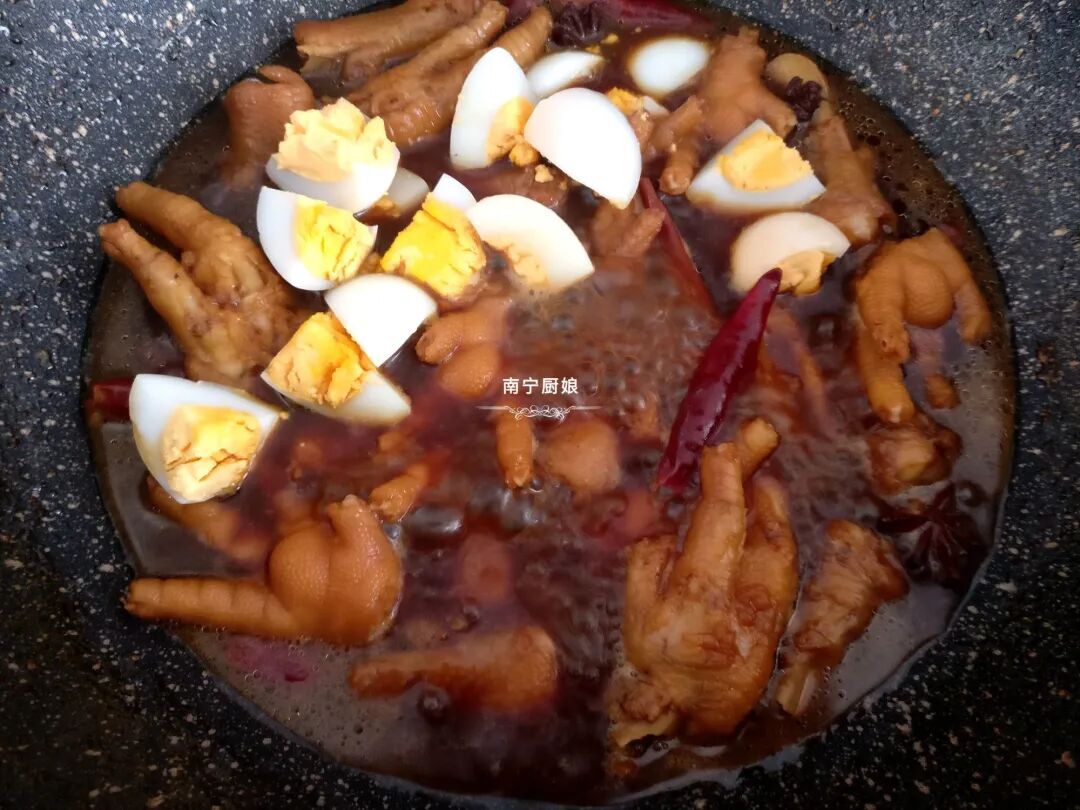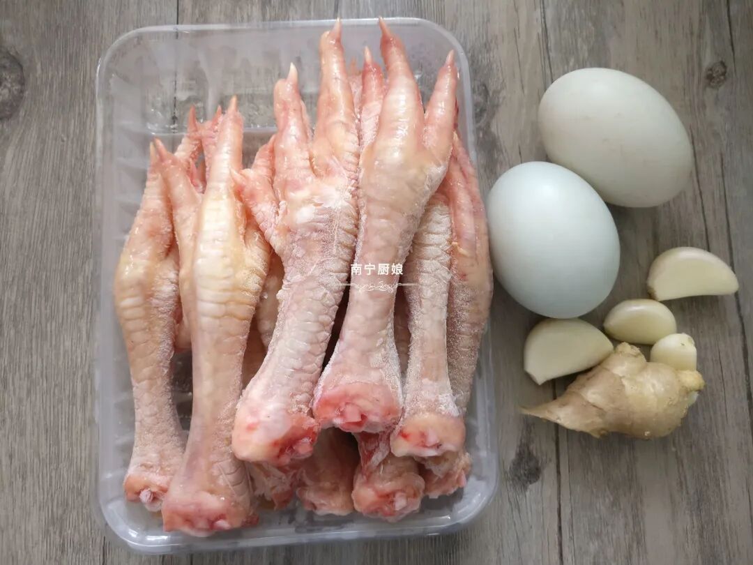 准备好食材:鸡爪500克、海鸭蛋2颗、蒜米4粒、生姜一块、老抽1勺、生抽3勺、白糖2勺、八角3颗、干辣椒6克