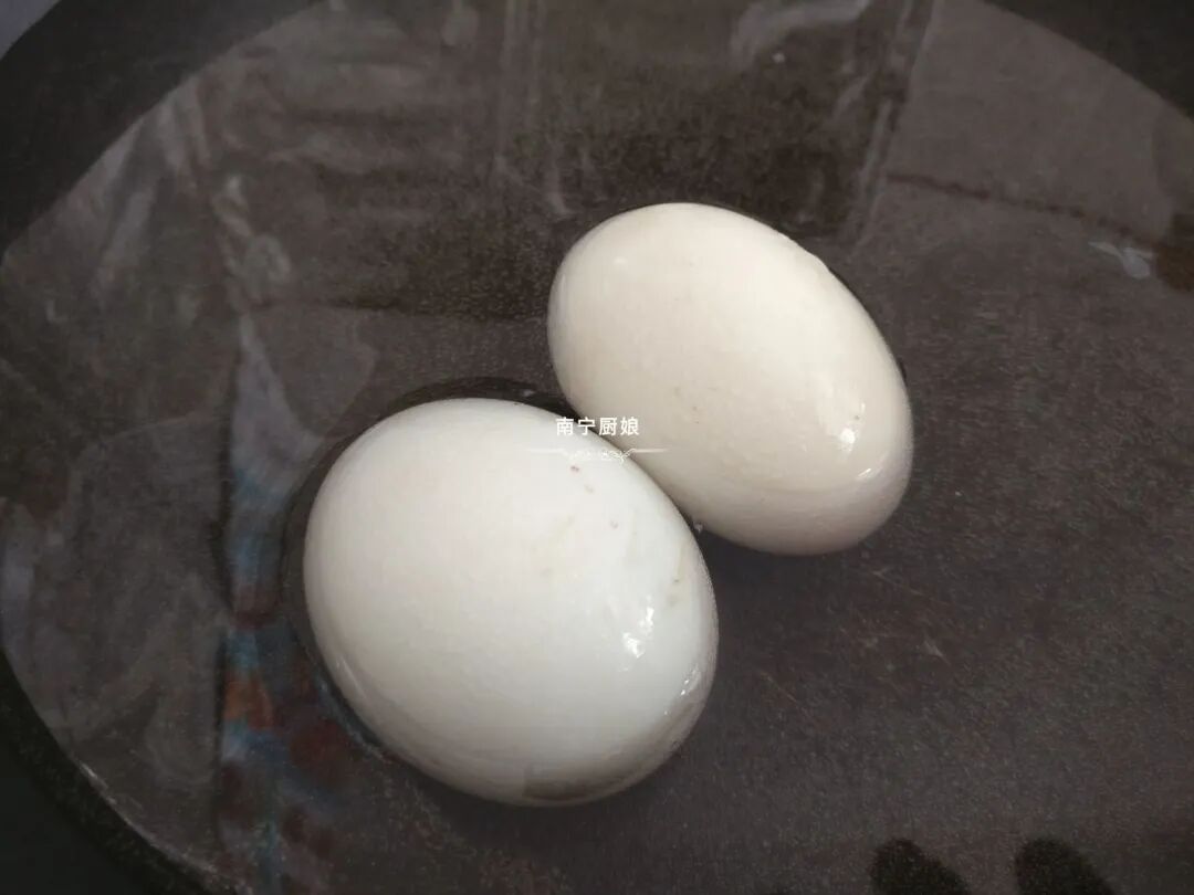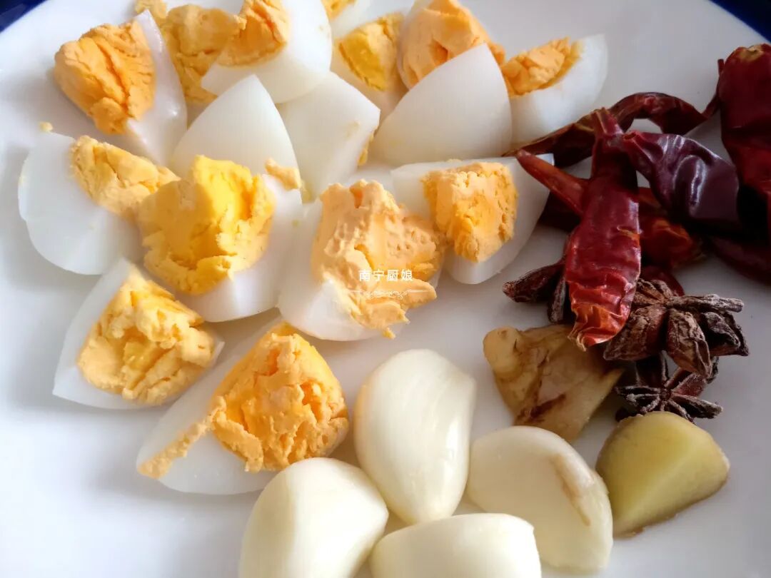 5、海鸭蛋煮好后,剥壳切成小块,蒜米剥皮,生姜切块,干辣椒和八角洗净待用