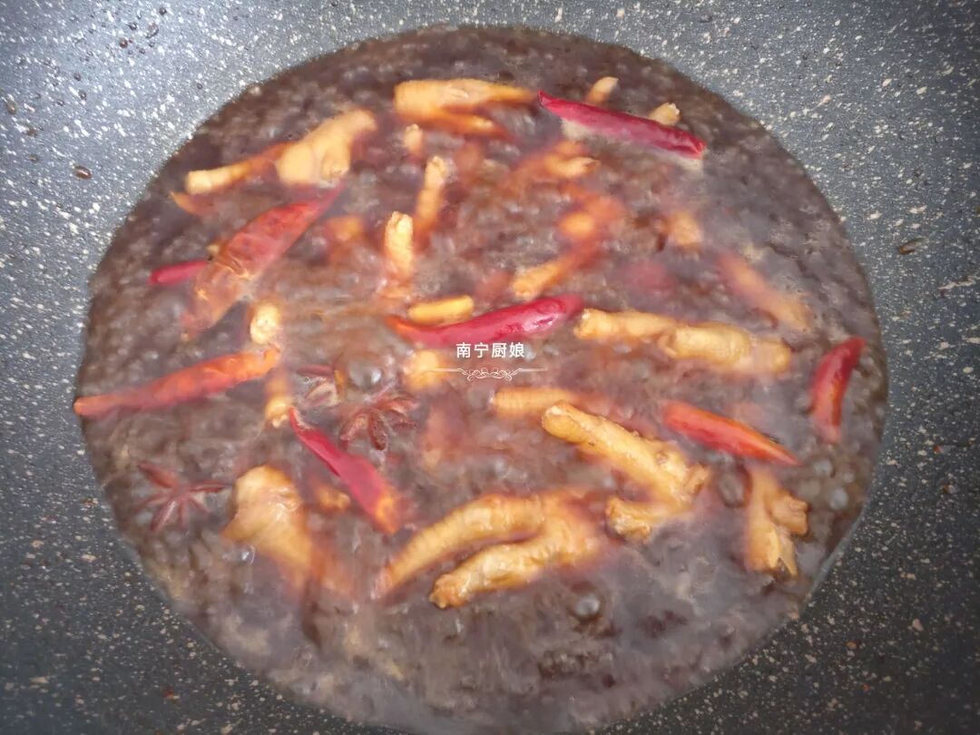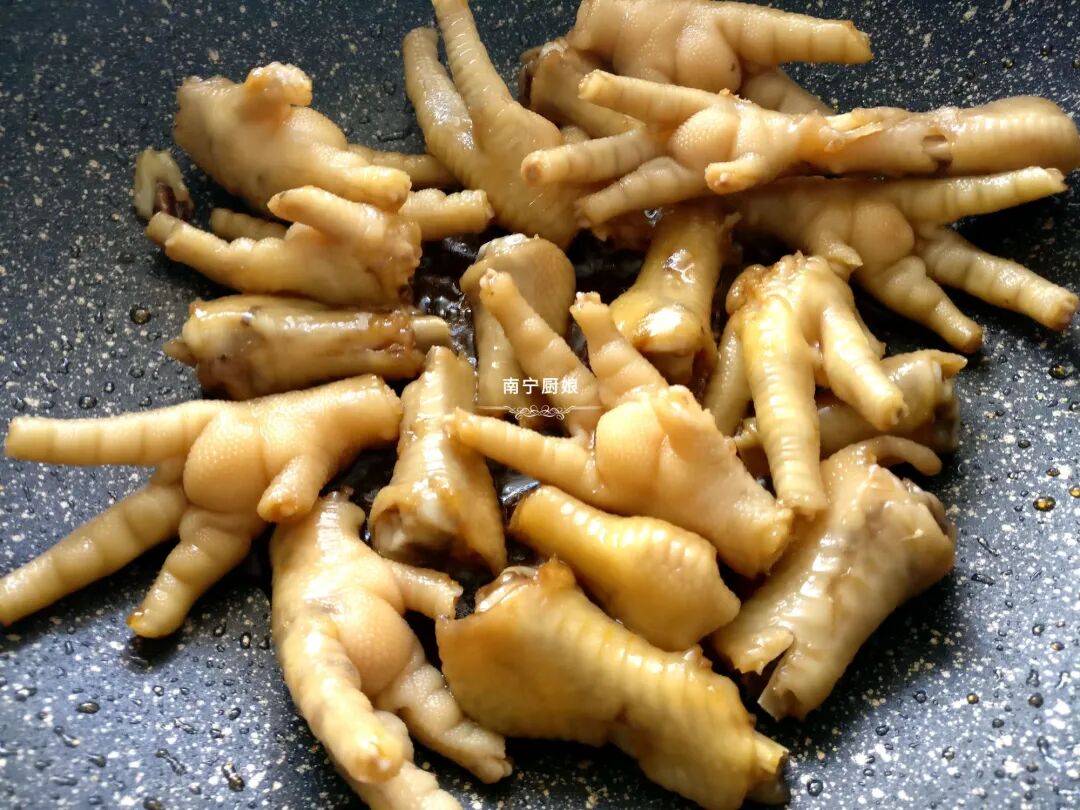 7、把鸡爪倒进去翻炒,让其均匀的裹上糖色