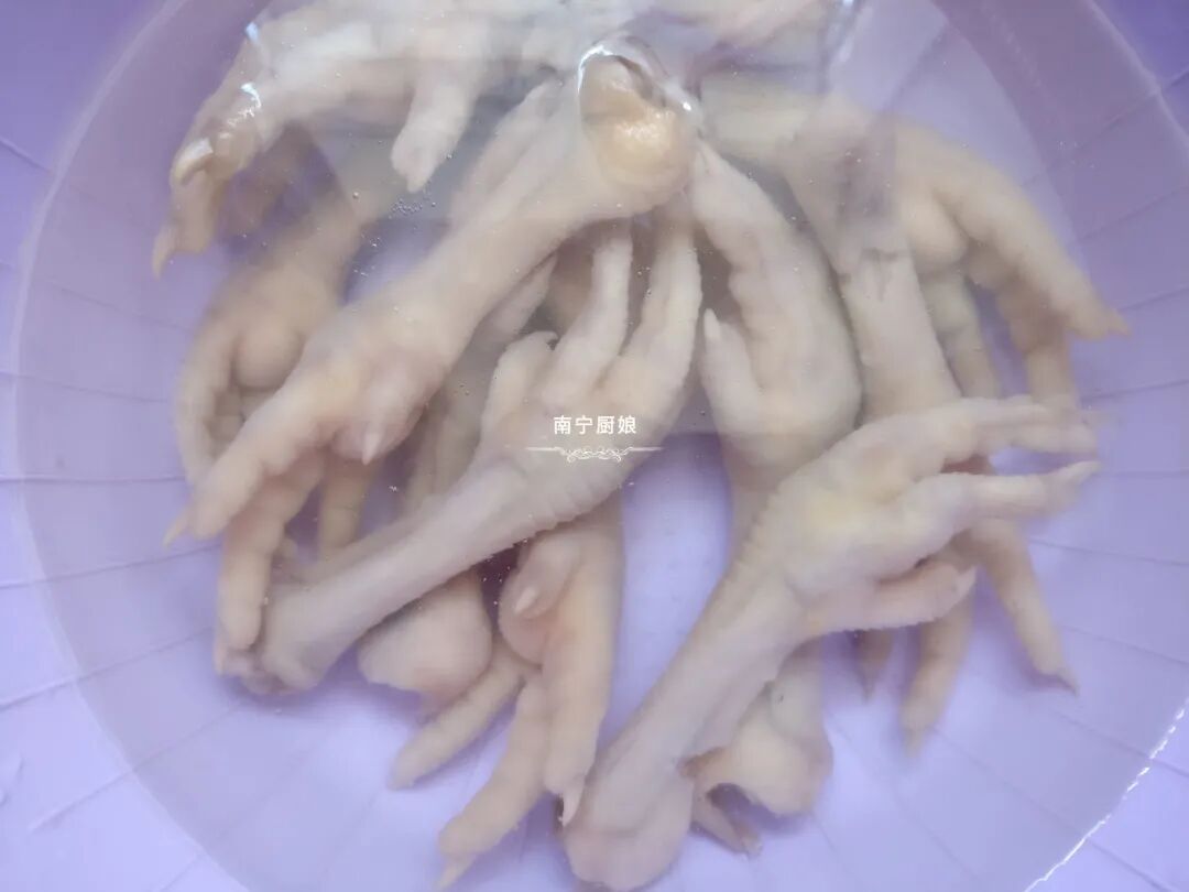 2、鸡爪焯水后,捞出来放在盆里,倒入冷水浸泡10分钟,期间可换水3次,鸡爪煮了后再放进凉水里浸泡,可以让鸡爪吃起来更加的有嚼劲哦,也顺便去除表面的粘稠物