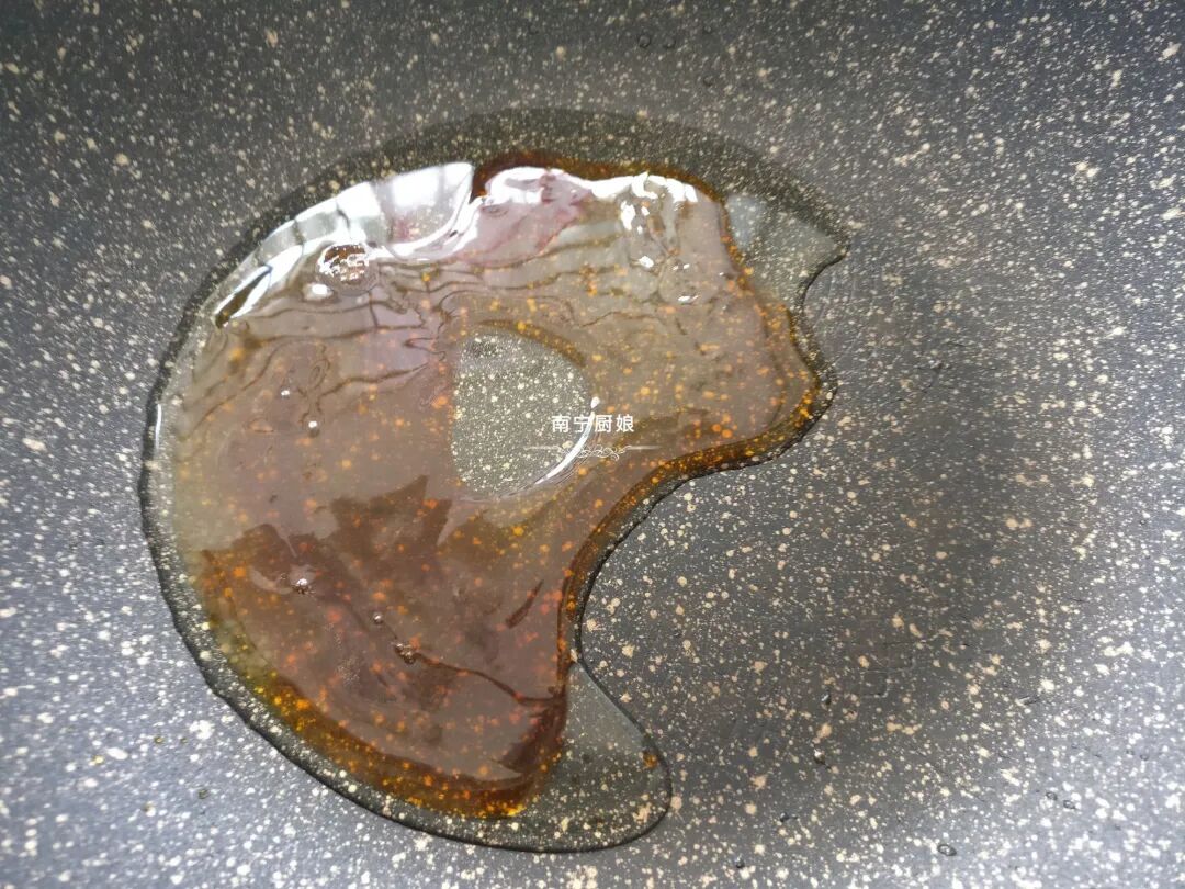 6、在平底锅里刷上一层油,倒入2勺白砂糖,开小火炒成糖色