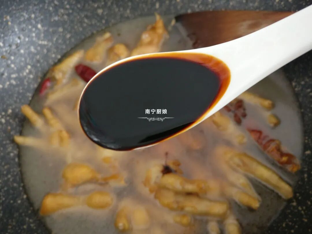 9、倒入2碗清水,放入1勺老抽,3勺生抽