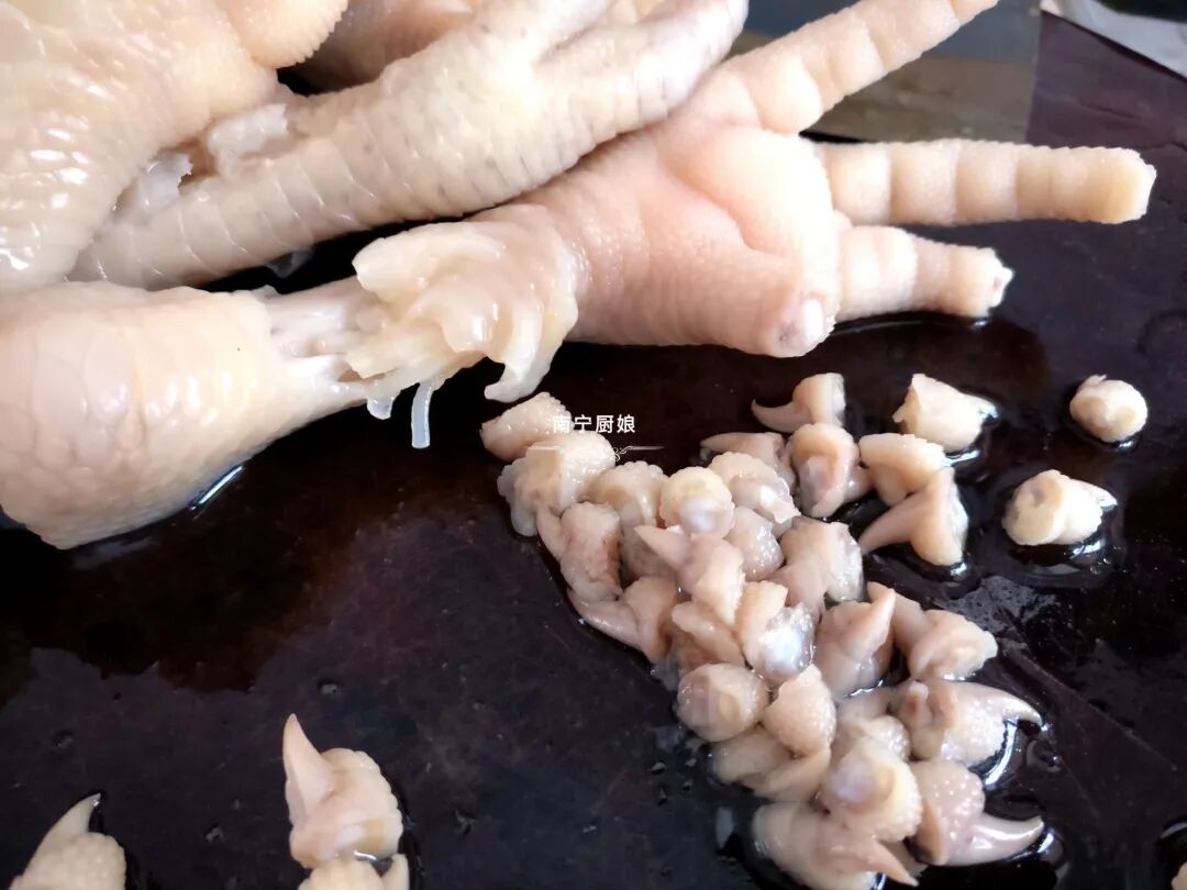4、趁煮海鸭蛋的空闲把鸡爪都砍去指甲,这一步才看到指甲,是因为我的鸡爪是冷冻的,还没解冻之前没办法砍掉,所以如果你们买回来的是新鲜的鸡爪,可以先砍掉了再煮哈