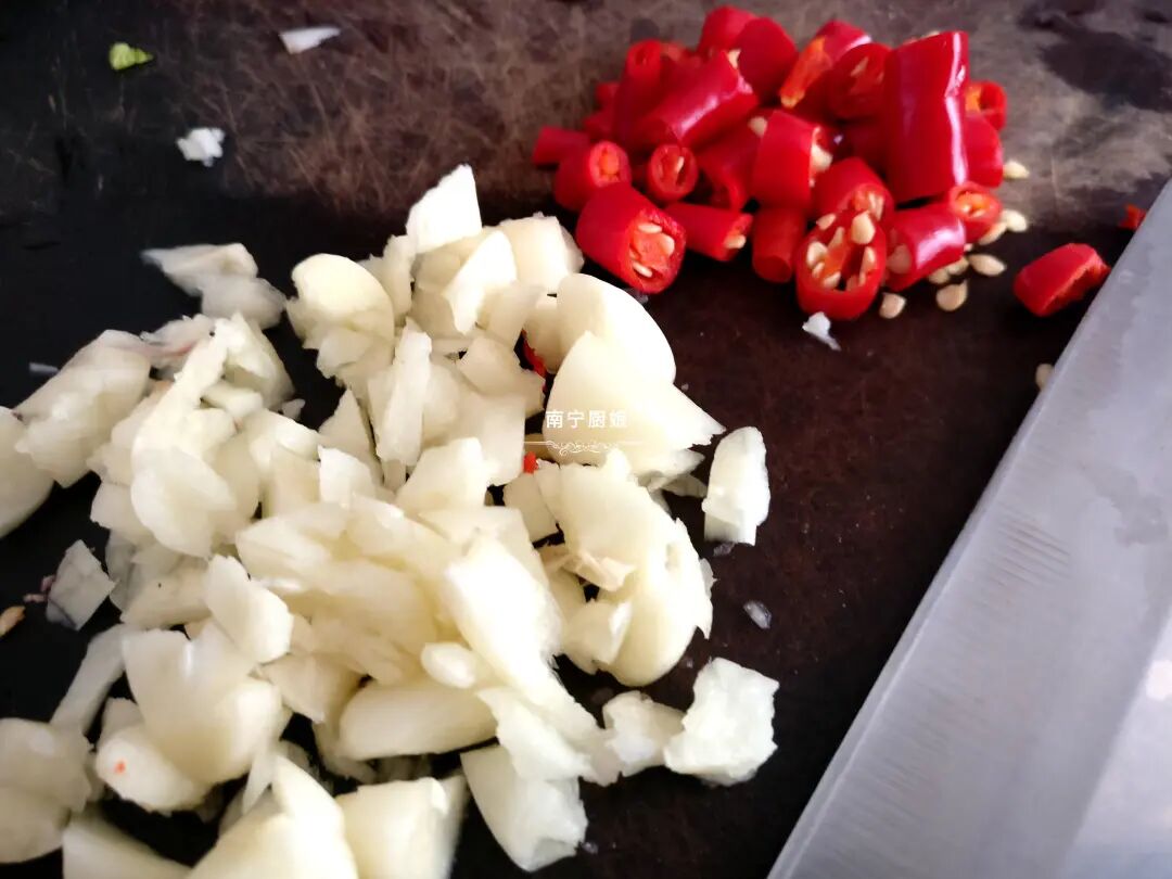 2、把蒜米去皮后切碎,小红椒洗净后切碎