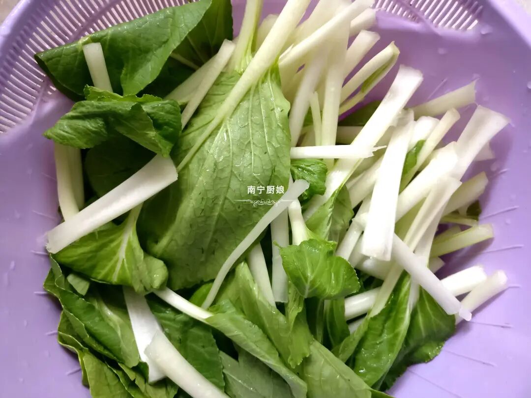 1、去掉坏叶后把较长的菜根折成两半,放在盆里f放入一小勺食盐浸泡5分钟后拿到水龙头冲洗干净沥干待用(放在盐水里浸泡主要是去除叶子上的农药残留)