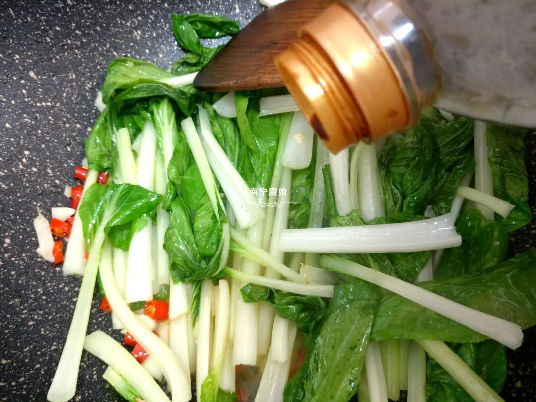 把食材准备好:小白菜一把、蒜米4粒、小红椒3颗、味极鲜一勺、食盐一勺