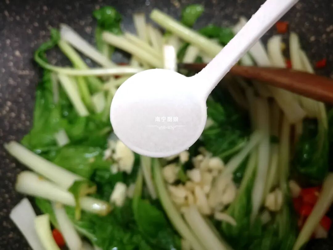 7、把剩下的蒜蓉倒进去,再放入一勺食盐调味,翻炒均匀