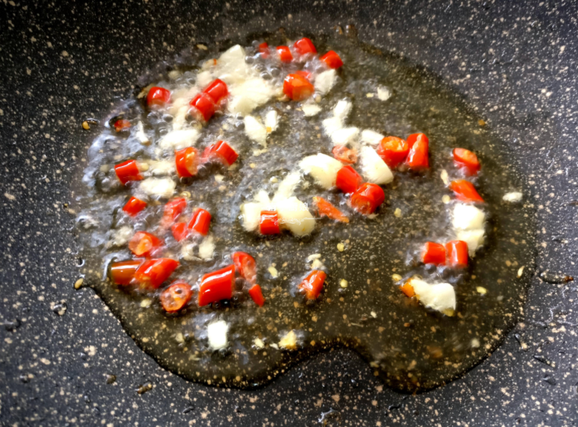 3、起锅,开小火预热锅,倒入适量的花生油烧热,倒入一般蒜米和小红椒爆香