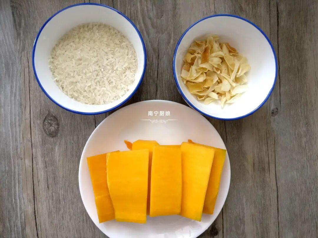 准备好食材:南瓜小半个、大米半碗、百合干小半碗