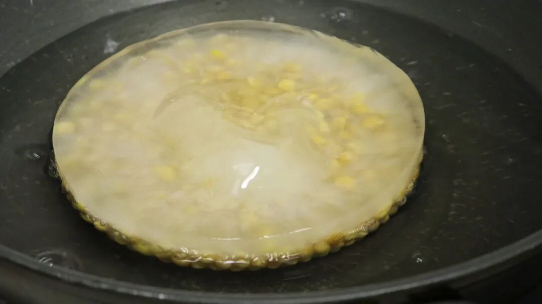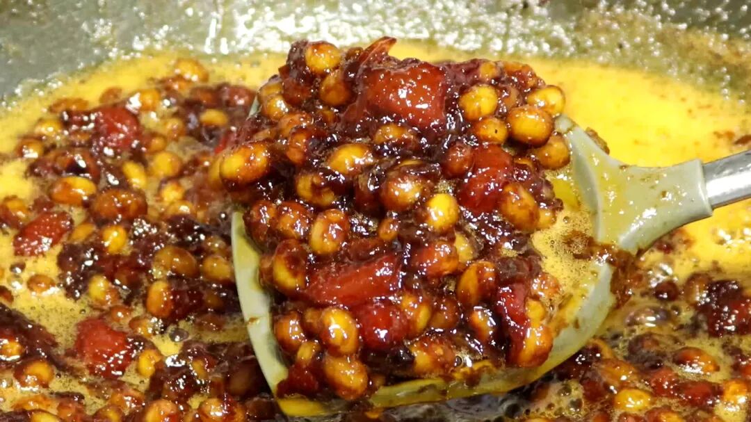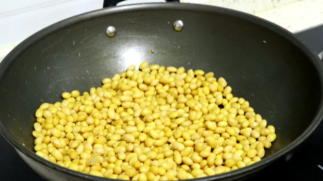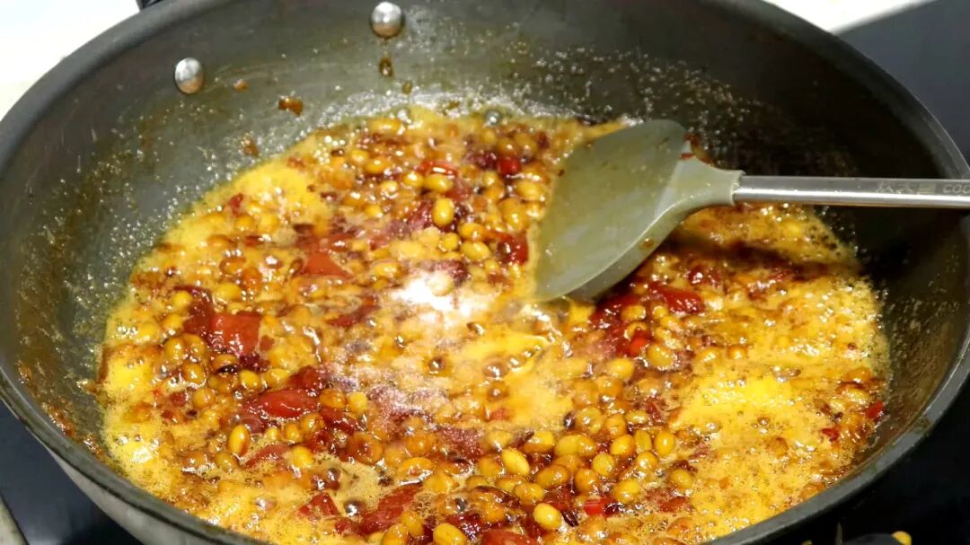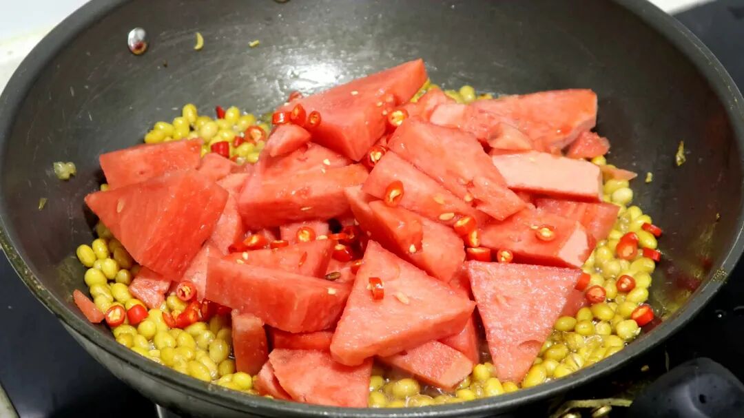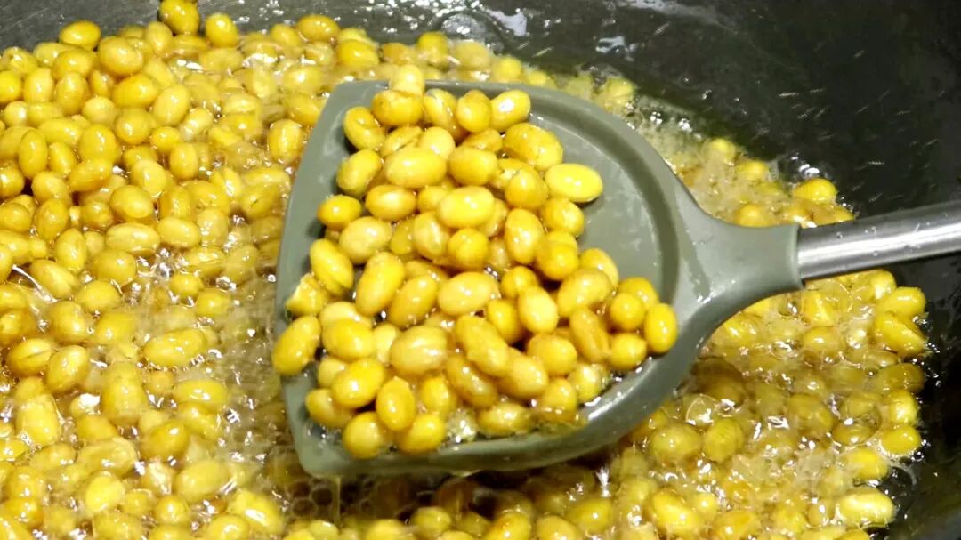 第八步:把油烧热就可以加入之前沥干水分的黄豆。用中小火慢炸,把黄豆当中残留的水分炸干期间,大家可以用铲子不停地翻动,防止黄豆互相粘连在一起。咱们一直炸到黄豆的表皮微微金黄,并且闻到黄豆的香味。就像视频当中这样,有一层薄薄的酥皮,就可以加入咱们之前准备好的西瓜。