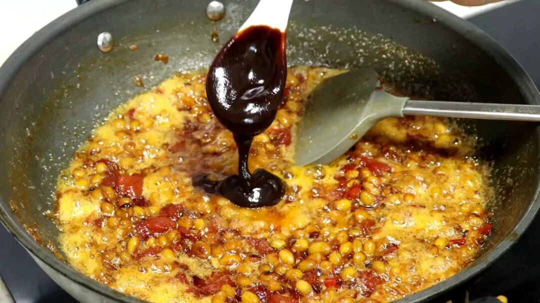 第十一步:一个小时后咱们再打开盖子,大家看,这个时候锅里的水和油都已经分离了,就说明我们的西瓜黄豆酱也已经熬好了,接下来开始调味,往锅里加入适量的食用盐,适量白砂糖。然后加入一勺甜面酱。再加入适量的高度白酒,高度白酒可以给我们的西瓜黄豆酱增香,同时还可以延长黄豆酱的保质期。这个时候咱们可以尝一下酱料的味道,如果觉得不够咸的,可以再增加少量的味精以及鸡精,味道都调好之后,再稍微搅拌一下,把锅里的食材都搅拌均匀,接下来就可以出锅啦。