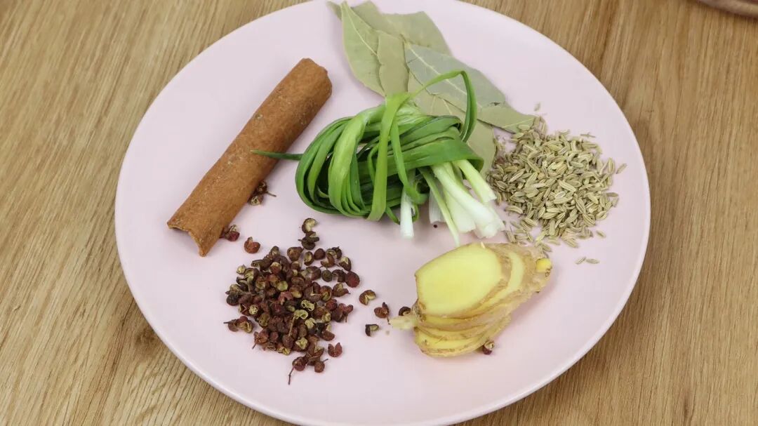 第五步:准备一个小碟子,打一个葱结,一小把花椒,几粒桂皮,几片香叶,一小把小茴香,几片生姜,我们的大料就准备好了。