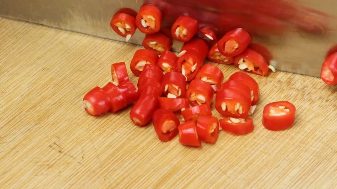 第四步:接下来准备适量的小米辣,把小米辣切成辣椒圈,喜欢吃辣一些的朋友可以多放一些,不能吃辣的也可以不放。