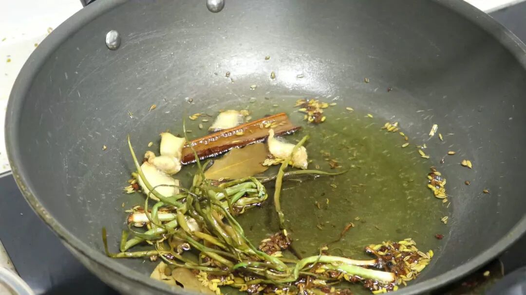 第七步:把锅洗干净,加入多一些的食用油。把之前咱们准备好的大料一起放进锅中小火慢炸,炸出香料的香味,然后用滤网把香料全部捞出来。