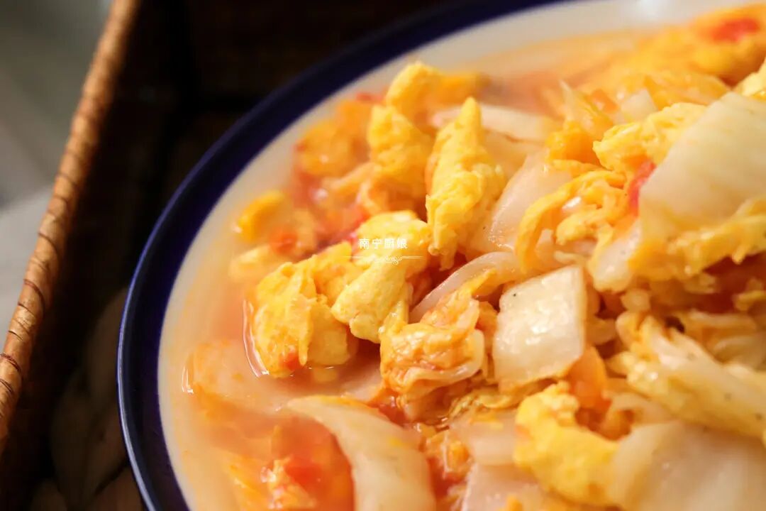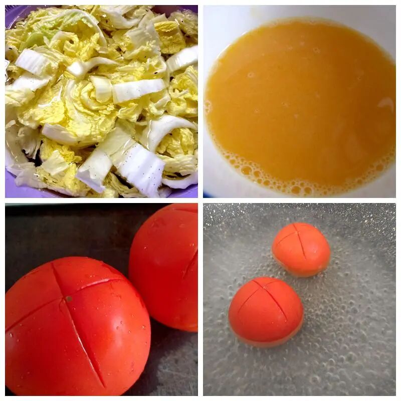 1、把娃娃菜切段后放在盆里,倒入没过的清水,再放入一勺盐浸泡10分钟,鸡蛋打入碗里,放入适量的盐搅拌均匀待用,西红柿洗净后在底部切十字刀,然后在锅里烧热半锅水,把西红柿放进去烫上1分钟让其脱皮,在底部切上十字刀再放进热水里烫,主要是方便后续好剥皮