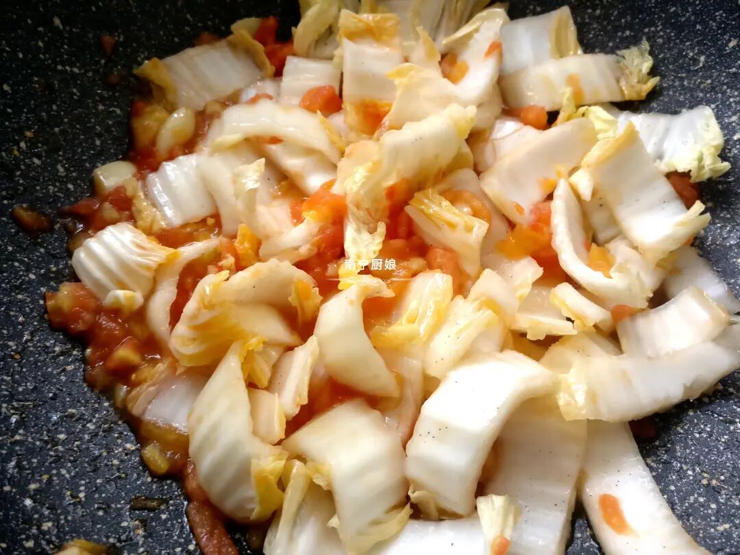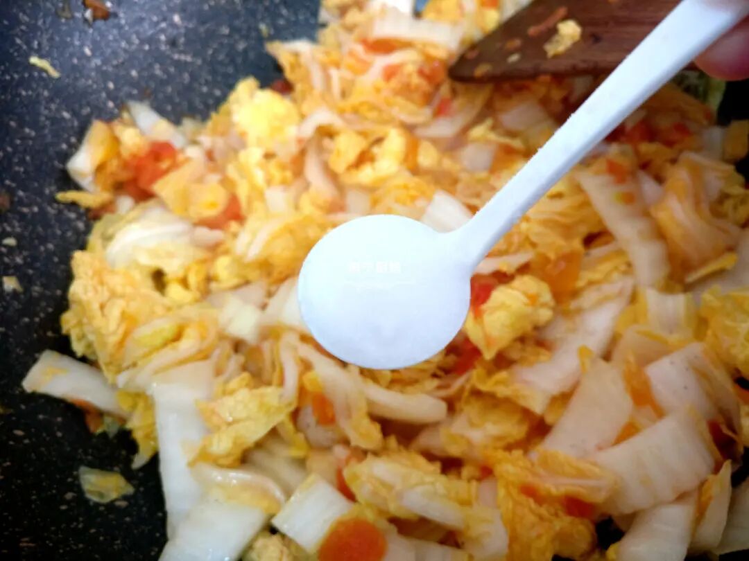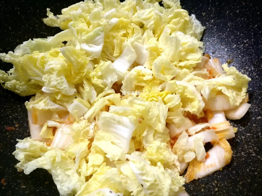8、把娃娃菜也翻炒至9成软后,放入一勺食盐调味翻炒均匀