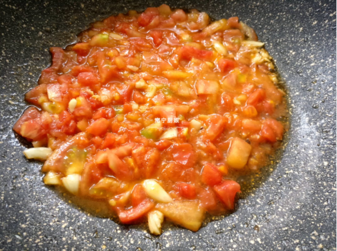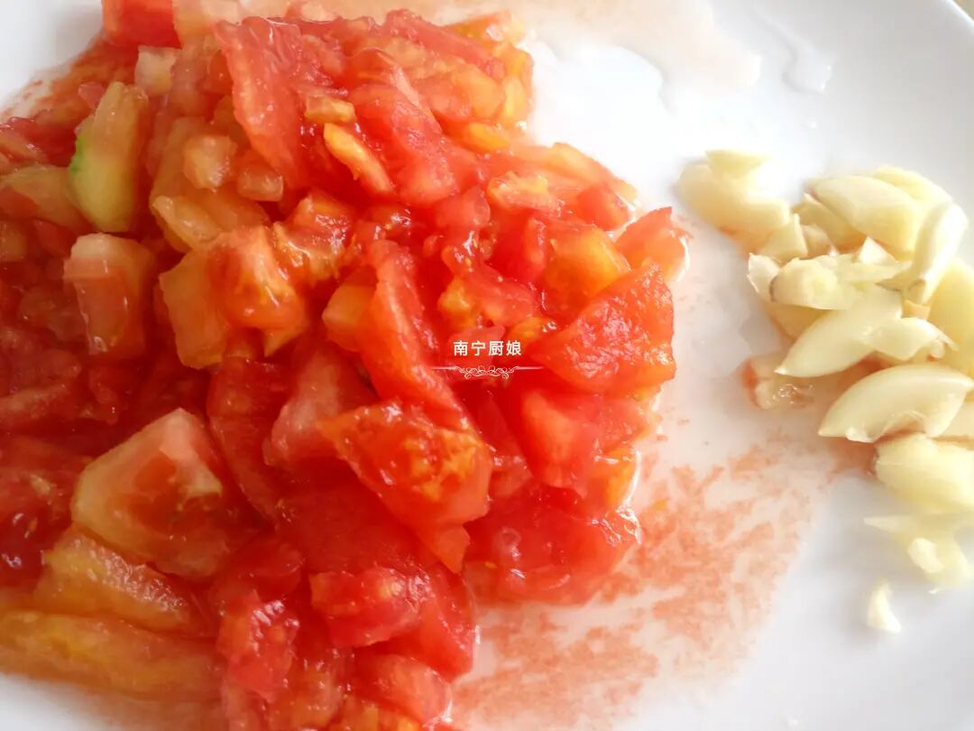 2、把西红柿剥皮后切碎,蒜米去皮后切碎