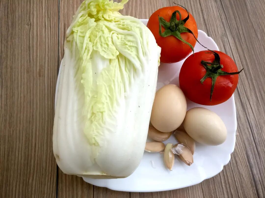 准备好食材:娃娃菜一颗、西红柿3个、鸡蛋3颗、蒜米5粒