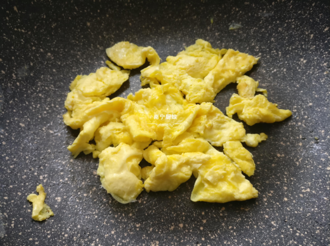 3、在不粘锅里刷上一层油,开小火烧热后把鸡蛋液倒进去翻炒成块,盛出装碗待用