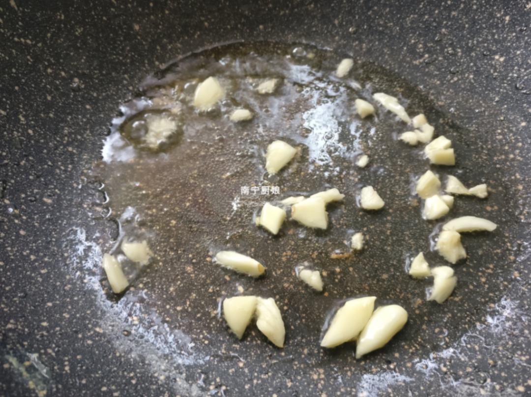 4、继续在锅里倒入适量的油小火烧热,把蒜米倒进去爆香