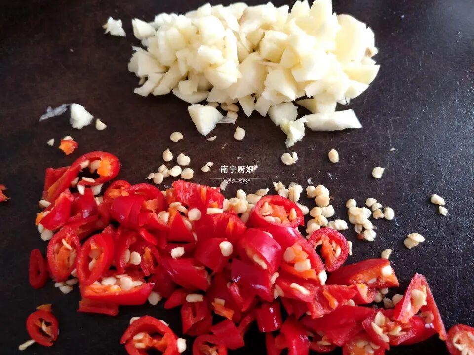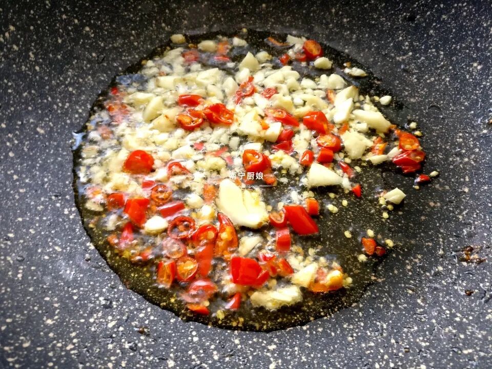 3、开小火预热锅,然后在锅里倒入花生油烧热后把小红椒和蒜米爆香