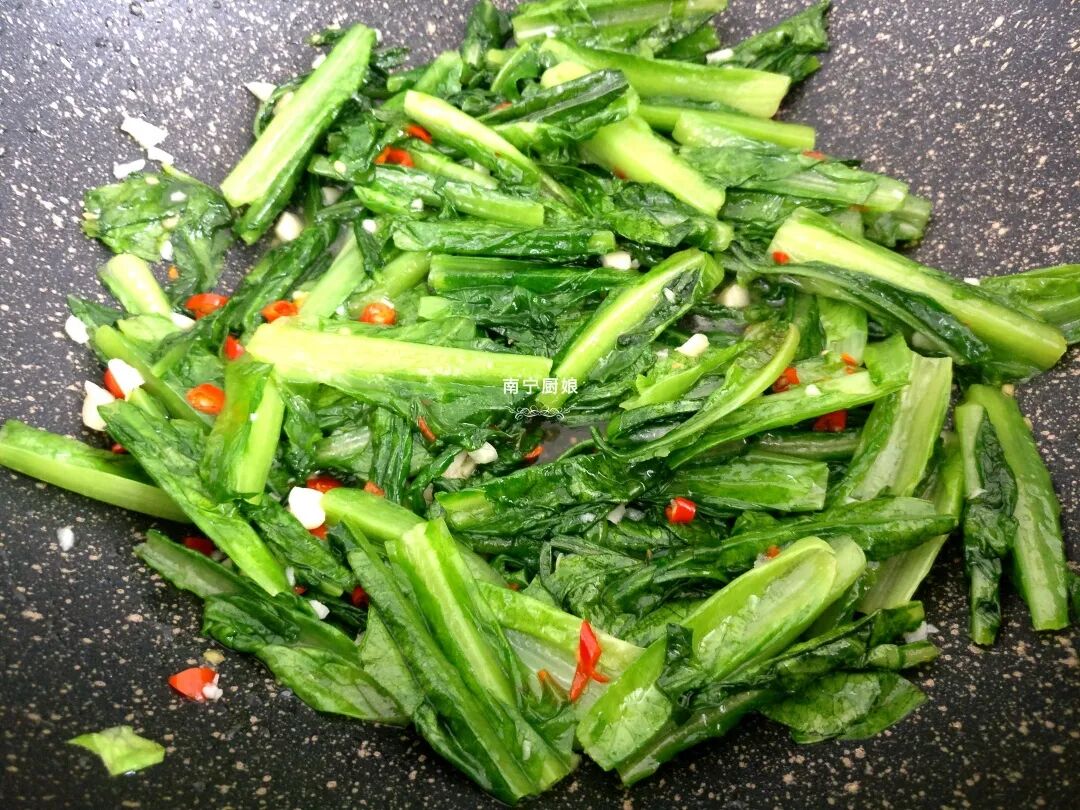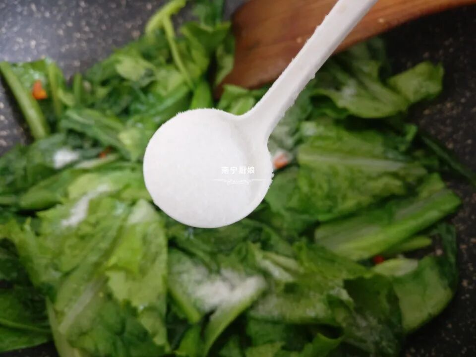 6、把油麦菜炒至断生后即可出锅了,不要炒太久哦,炒太久了,菜叶都黄了,不仅影响口感,也会影响色泽