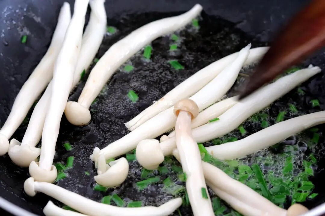 2、把海鲜菇倒进去一起翻炒均匀(海鲜菇可以切段也可以整根,看个人喜好哈)
