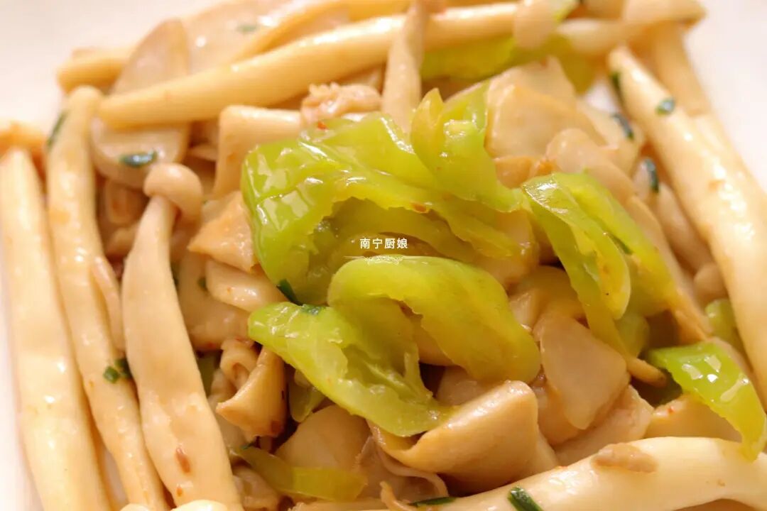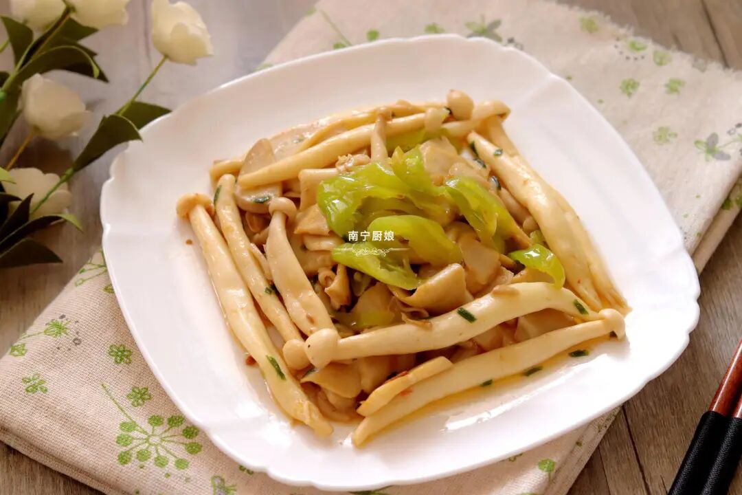 这道菜的食材为杏鲍菇、海鲜菇、青椒。海鲜菇质地脆嫩,气味芬芳,味道鲜鲜,口感细腻,菌肉肥厚,具有海蟹味,因此也叫蟹味菇。海鲜菇含有8种人体必需氨基酸,常食海鲜菇具有抗癌、防癌、提高免疫力、预防衰老、延长寿命的功效。而杏鲍菇同样菌肉肥厚如鲍鱼,口感鲜嫩,味道清香,营养丰富,能烹饪出多种美味佳肴。常吃杏鲍菇具有降血脂、降胆固醇、促进胃肠消化、增强机体免疫能力等功效,极受人们喜爱。