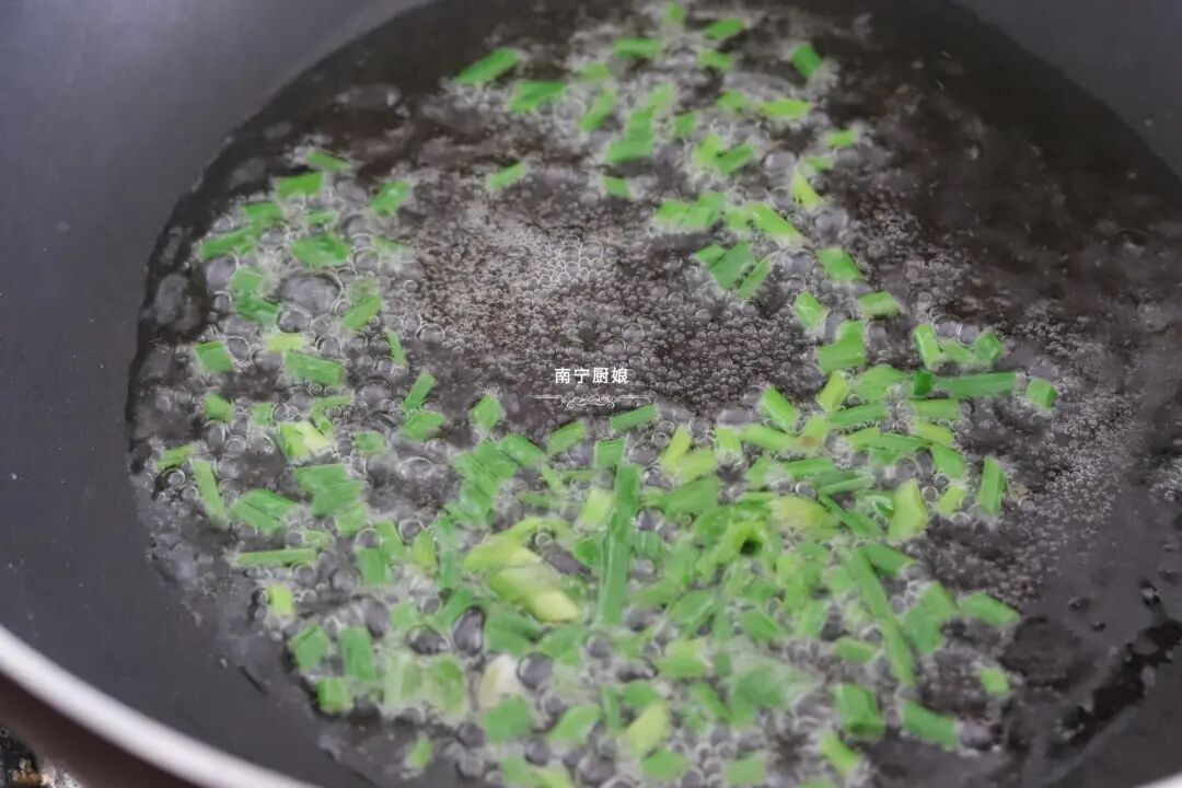 1、起锅,倒入适量的花生油,小火烧热后把洗净切碎的葱花倒进去爆香