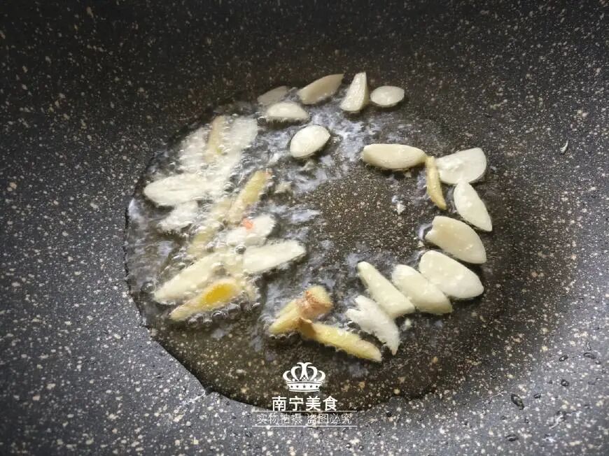 2、把锅预热,然后倒入适量的花生油(我们家喜欢吃花生油,你们用其他的油也可以),倒入蒜米和姜片爆香