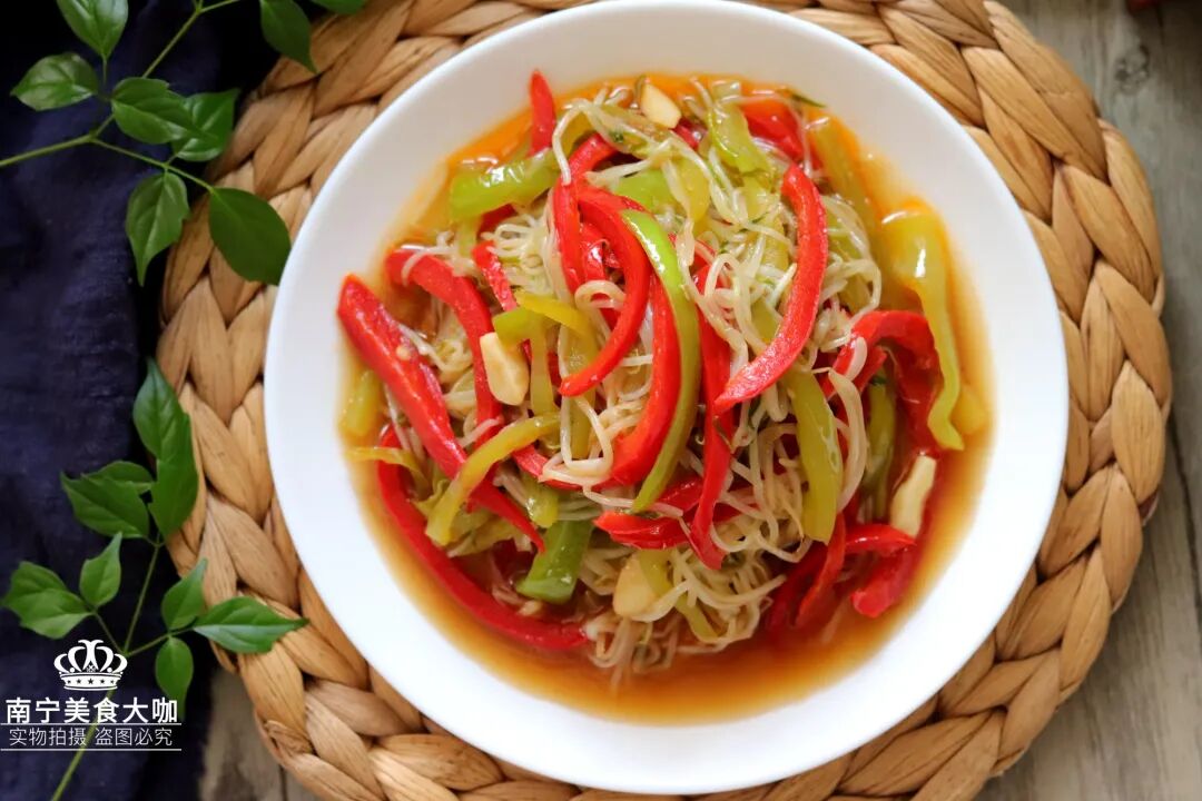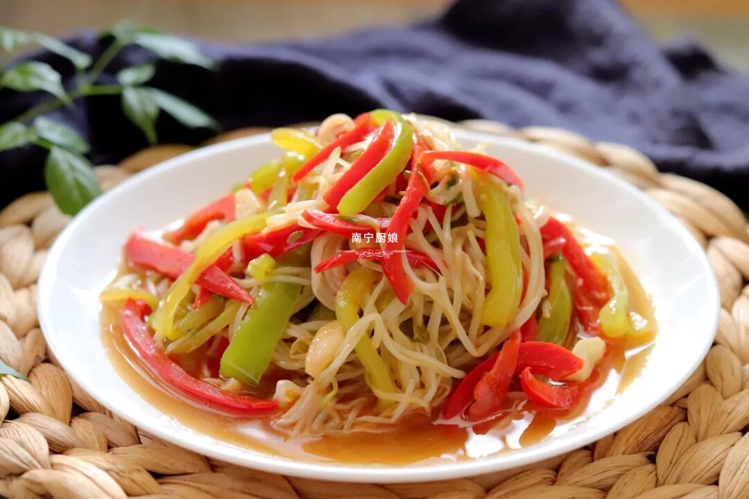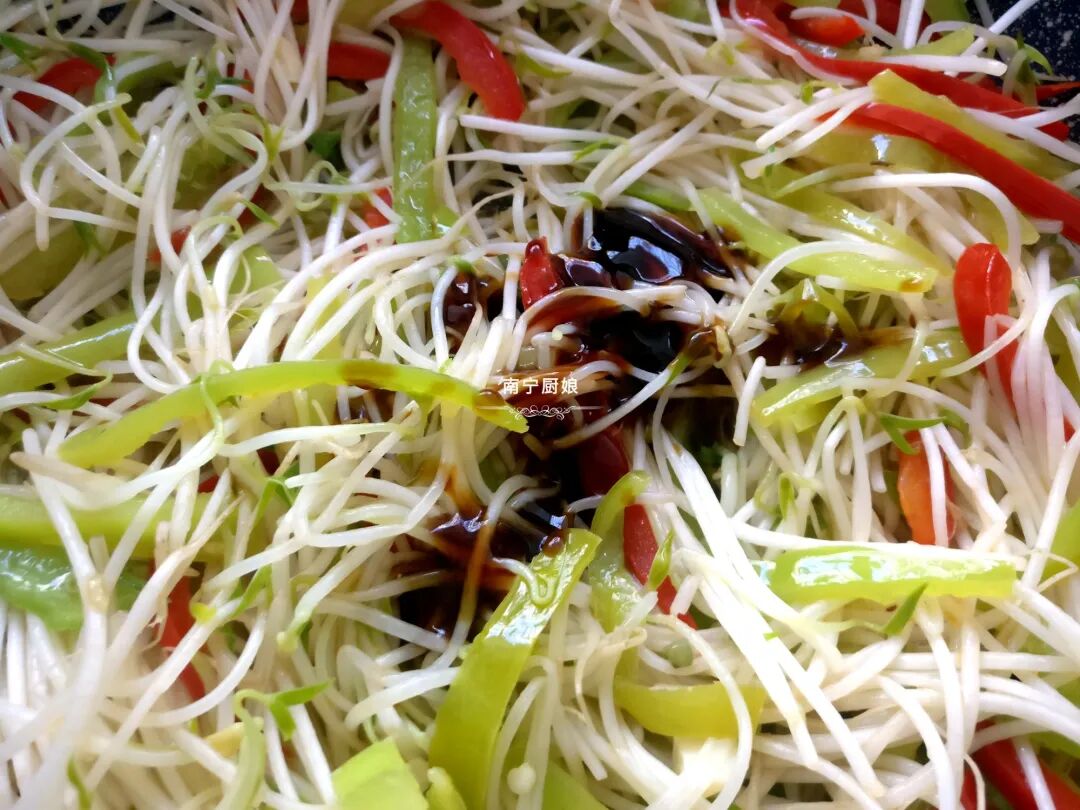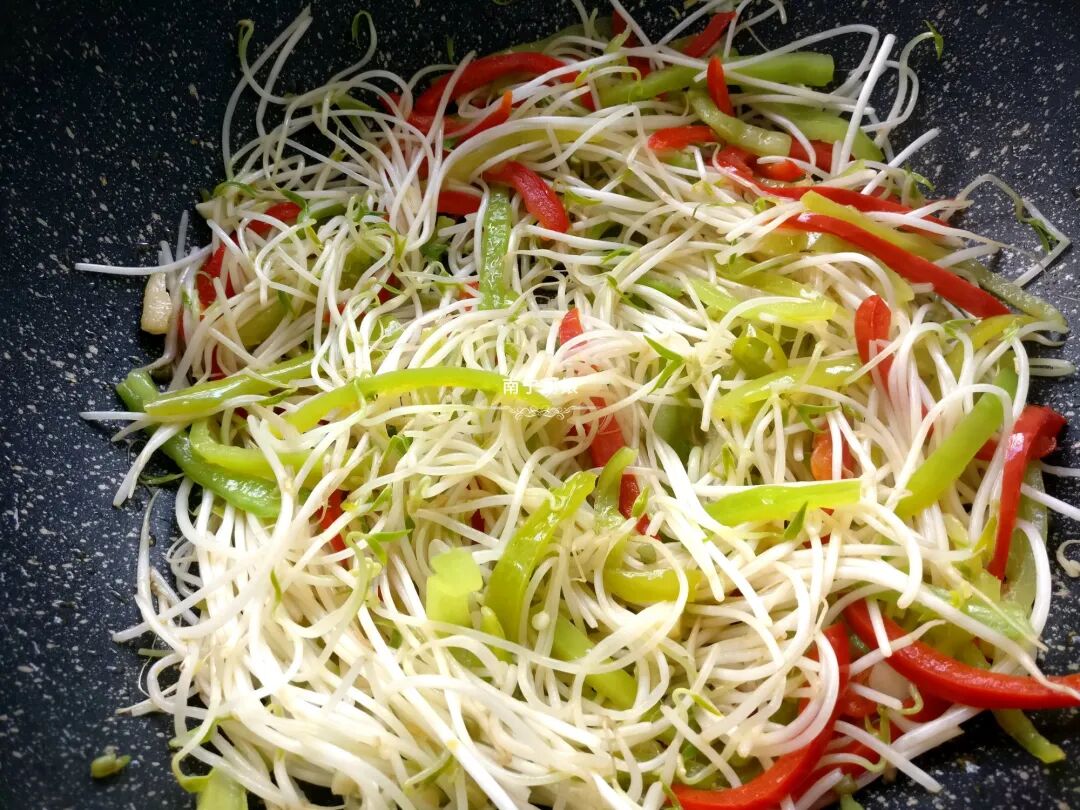 看,一盘色香味俱全的豆芽炒青红椒丝下饭菜就做好啦