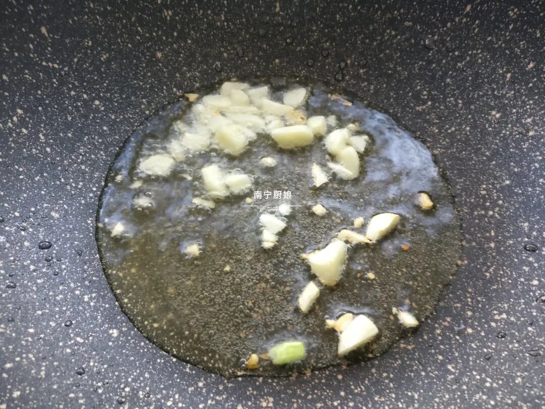 2、起锅,小火预热锅,倒入适量的花生油烧热,把蒜米倒进去爆香