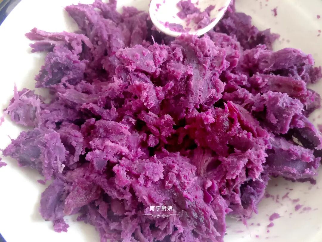 4、用汤勺把紫薯按压成泥