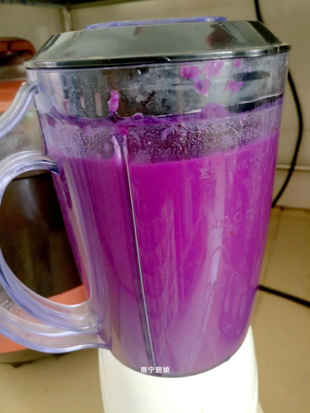 6、再放入没过紫薯2个指节的纯净水,注意是纯净水哦,不是白开水也不是自来水哈,自来水和白开水放进去搅拌出来的味道真是和纯净水相差太远,开动搅拌机搅拌