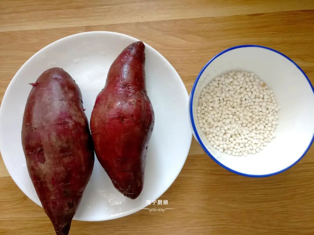 准备好食材:紫薯2个、西米100克